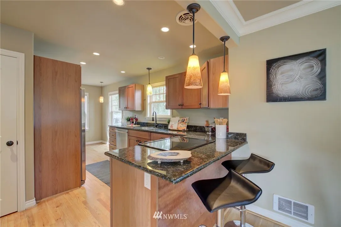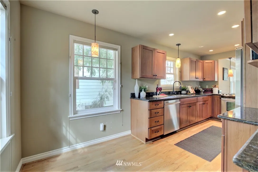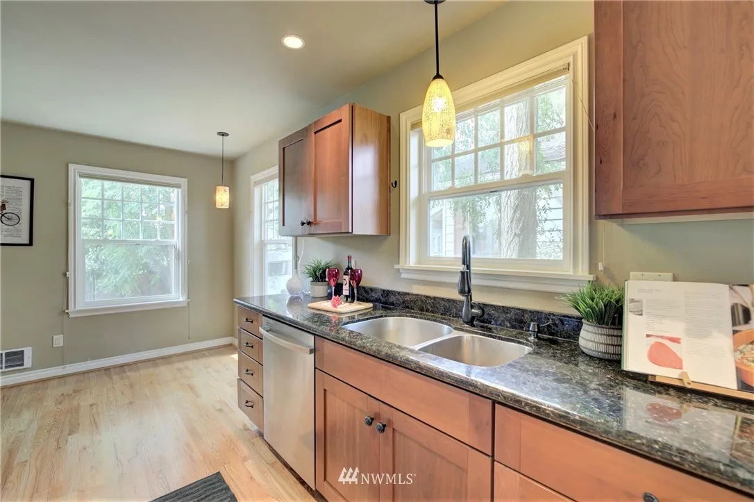Beautiful Craftsman w/ many upgrades. Located in the heart of Ballard on a quiet street. Remodeled Kit.& Bths Lg. kit Kitchen w/lots of counter space, & an eat in breakfast nook. The lower level has 2 bdrms, 1 bath, and a large family rm. The main level is all hardwood floors; the lower level has fairly new carpet. The sewer line has been updated and the exterior has been painted in the past 24mths. Long driveway leads to spacious grg. Grg. was re-built 2 yrs. ago. Lots of fully fenced yard.