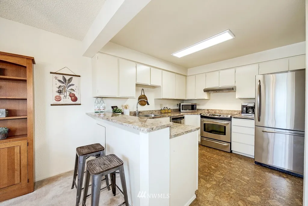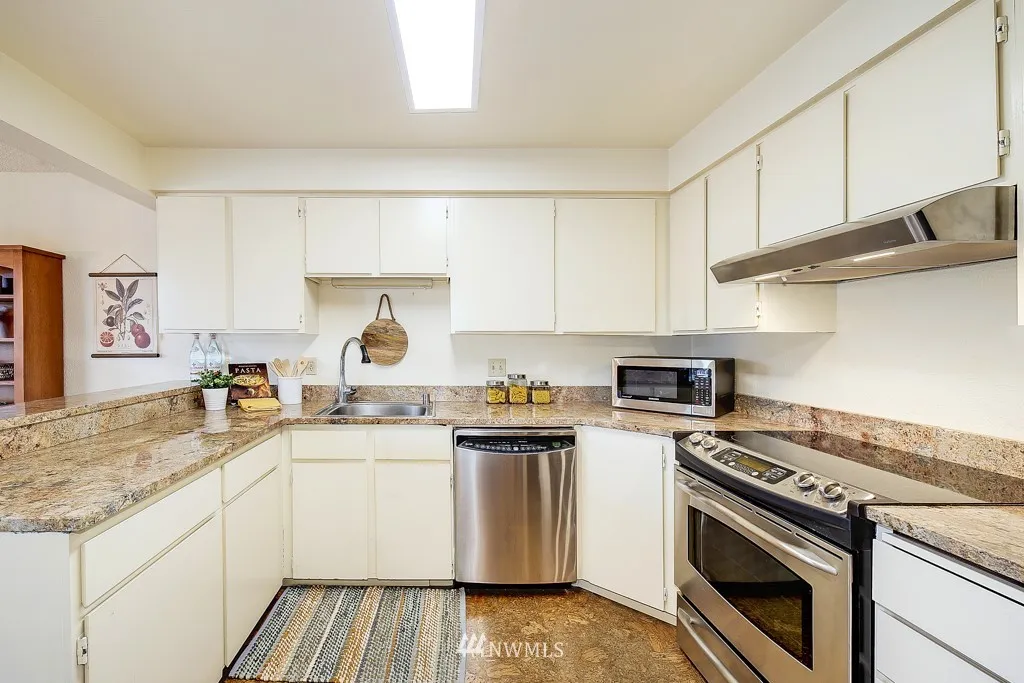 Quintessential urban lifestyle in fab West Seattle!Conveniently located across from Westwood Village.Starbucks,Target, QFC, restaurants, etc..Western exposure;abundant natural light.Private covered deck w/storage & territorial view.Updated kitchen w/SS appliances, cork flooring, granite counters, eating bar & pantry. Ensuite master, cozy wood fireplace, full size washer/dryer. Easy entry:only a couple of steps to your front door. Leave your car parked at home & take RapidRide to Downtown or SLU!