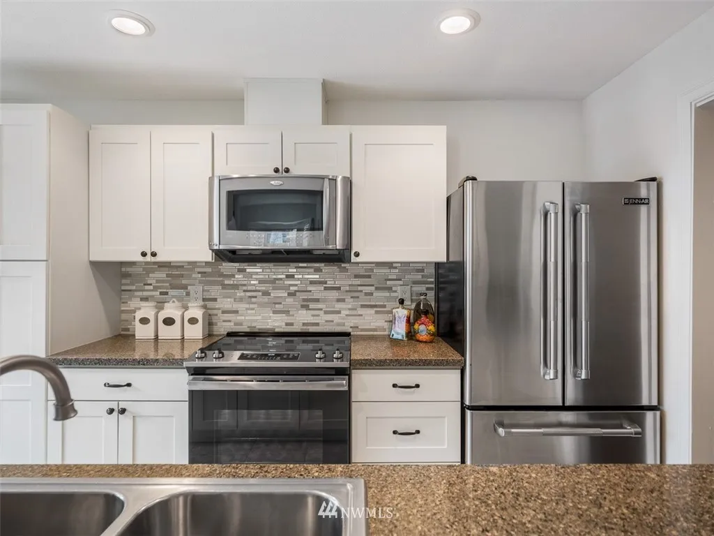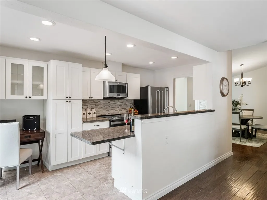 Charming condo in sought after Somerset Creek. Rambler style end unit in peaceful park-like setting. Separate living, dining rooms. Open concept Family room and Remodeled Kitchen; Granite, Stainless, higher end appliances. Vaulted ceilings. Hardwood floors. Fresh interior designer paint. Oversized 2 car garage. Stable, well run HOA. Sport Court, Guest Parking. Award winning Bellevue Schools. Easy access to I-90 Seattle or Bellevue.