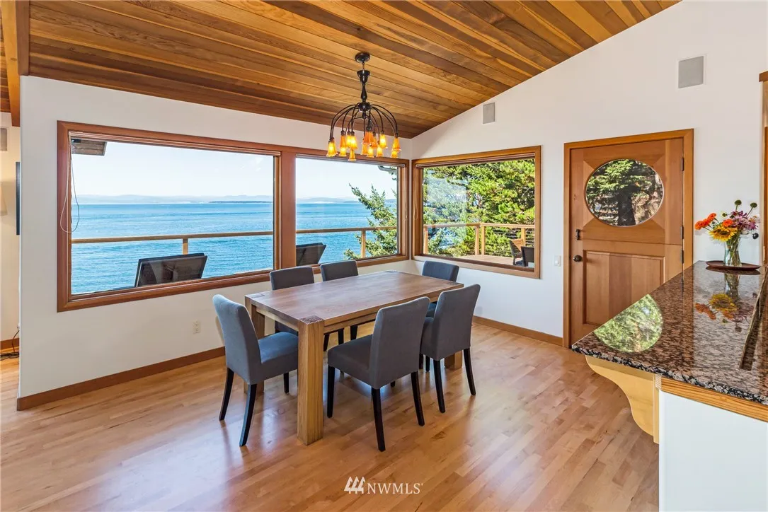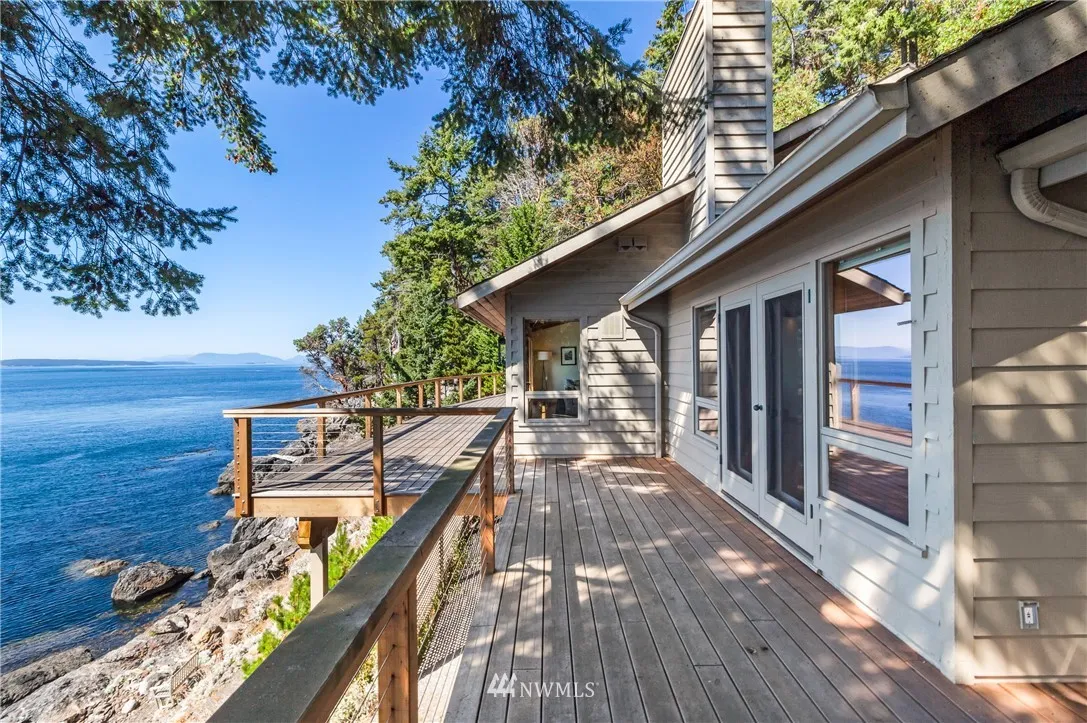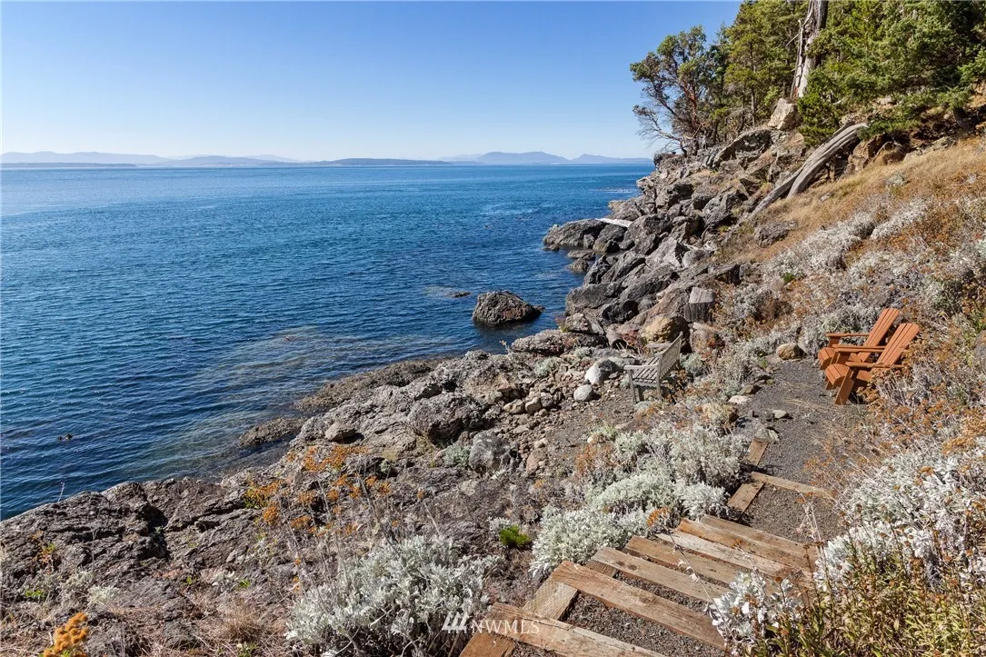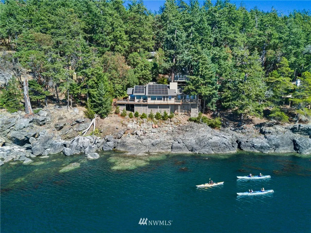 Nicely sited on the island’s coveted Western shore with views over the Straits to the Olympics, this gated estate is truly extraordinary. Designed for comfort and island style entertaining, the distinctive solar independent 2 bedroom/2 bath one level Northwest contemporary is rich in details with an atmosphere of fine finishes in an open concept that spills effortlessly onto al fresco decking. Guest house, detached garage with studio, stairs to the beach. A hidden beauty. Relax and retreat.