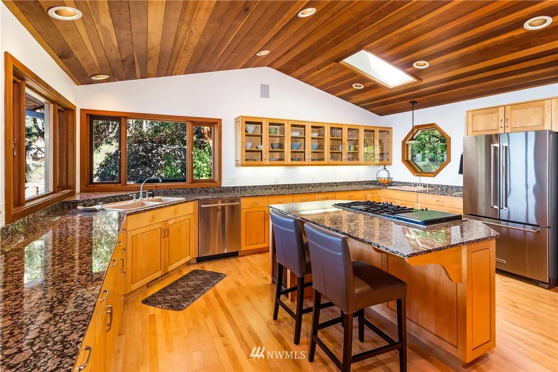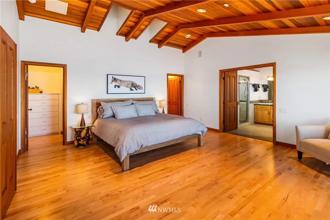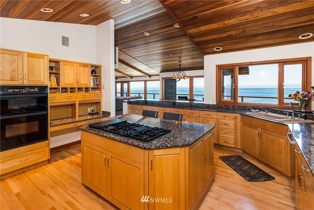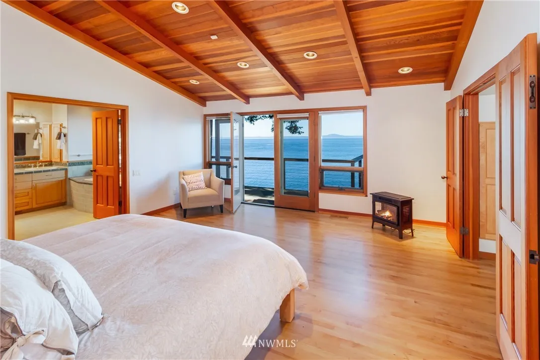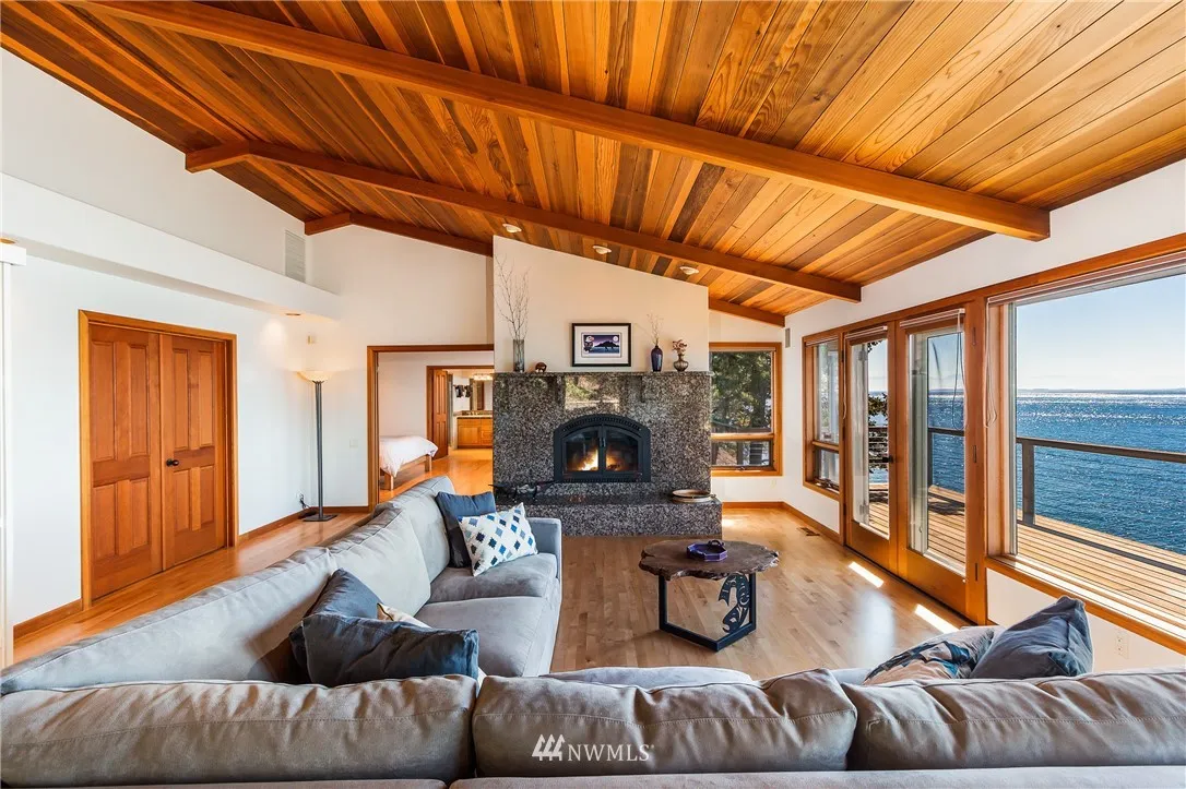 Nicely sited on the island’s coveted Western shore with views over the Straits to the Olympics, this gated estate is truly extraordinary. Designed for comfort and island style entertaining, the distinctive solar independent 2 bedroom/2 bath one level Northwest contemporary is rich in details with an atmosphere of fine finishes in an open concept that spills effortlessly onto al fresco decking. Guest house, detached garage with studio, stairs to the beach. A hidden beauty. Relax and retreat.