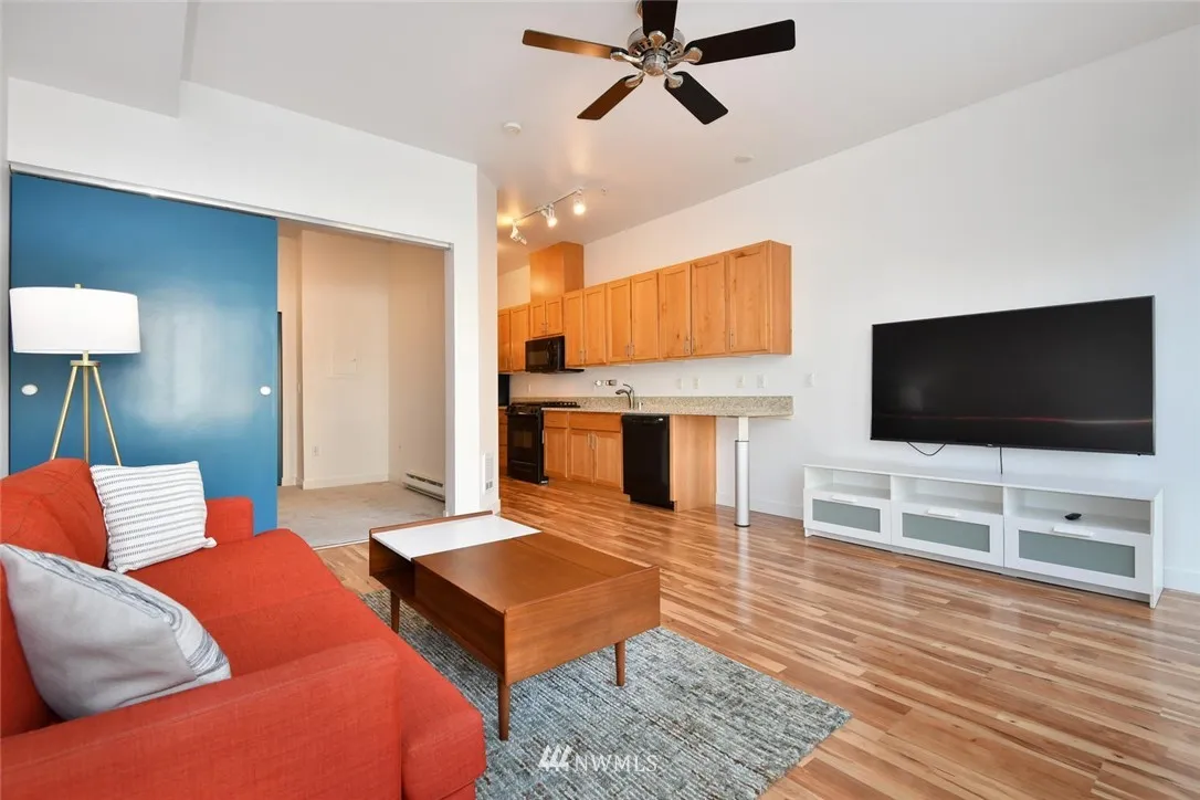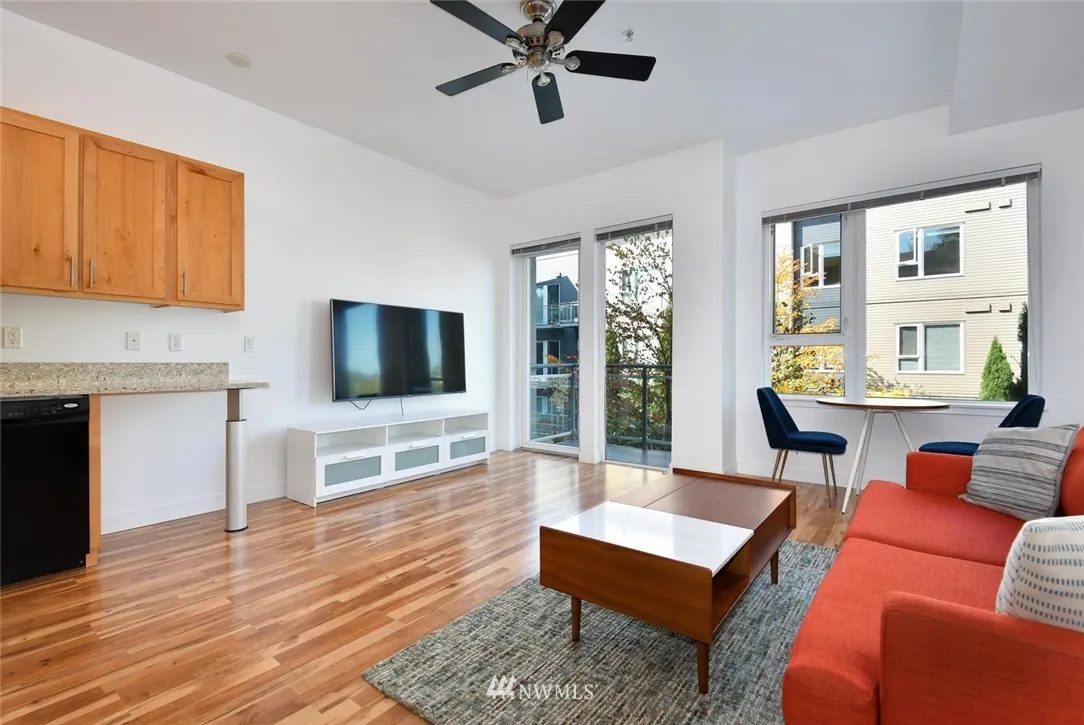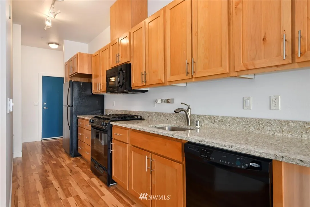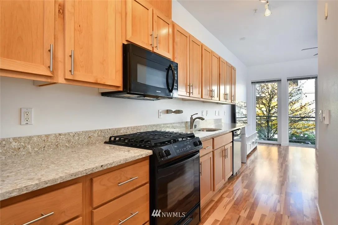 The Boulevard offers the class & modern design you've been looking for. This home boasts hardwood floors, 10 foot ceilings & slab granite. This generous 1 BR 1 BA condo w/balcony and territorial view is not to be missed. The kitchen has tons of cabinets & great granite counters w/ plenty of room to cook. The large contemporary bath with full tub/shower and full size washer and dryer. All appliances stay. Don't miss the parking space in the shared garage. Live the Downtown Kirkland Lifestyle!