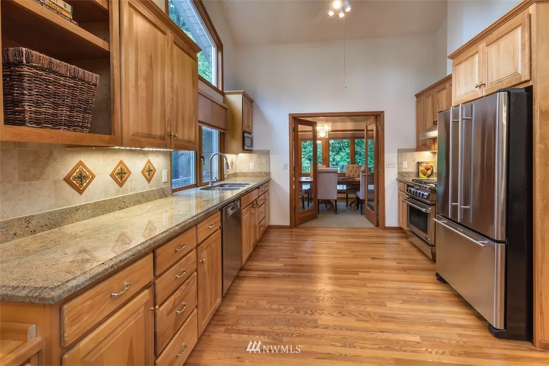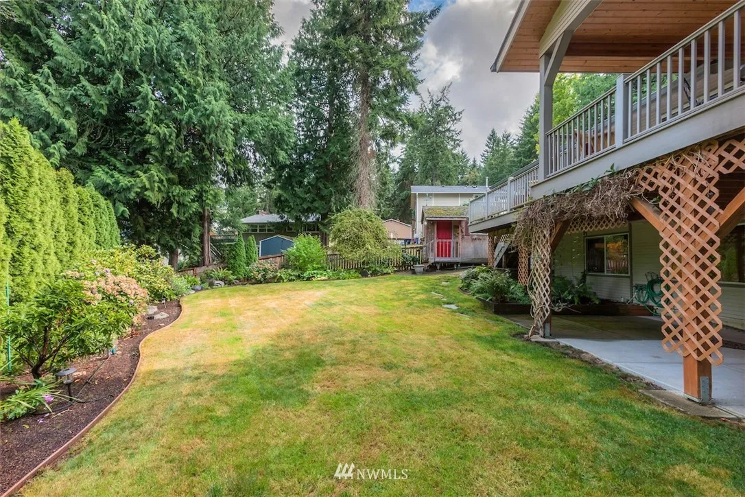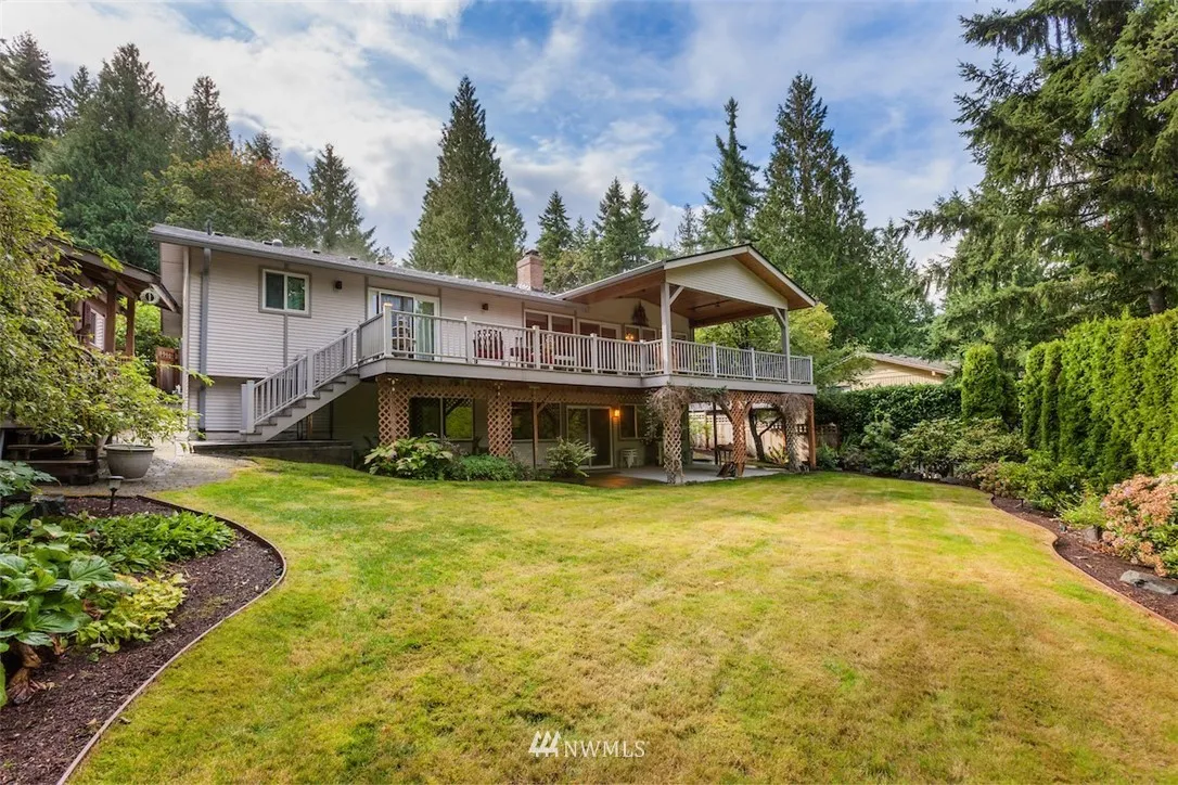Simply Awesome! Large open remodeled kitchen. Clerestory design w/ vaulted ceilings lets in tons of natural light. Covered Trex view deck. Massive dining room area perfect for entertaining. Family room with built-ins. Master opens to deck, plus walk in closet & remodeled master bath. Oversized mainfloor bdrm w/ sitting area (was 2 bdrms). Lower level with bar, great recroom, sauna, 3/4 bath, gas fireplace, large bdrm & huge storage/shop area. Great private yard. Issaquah schools.