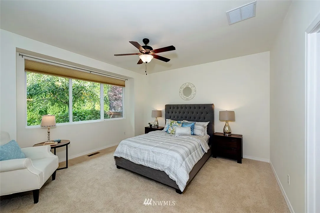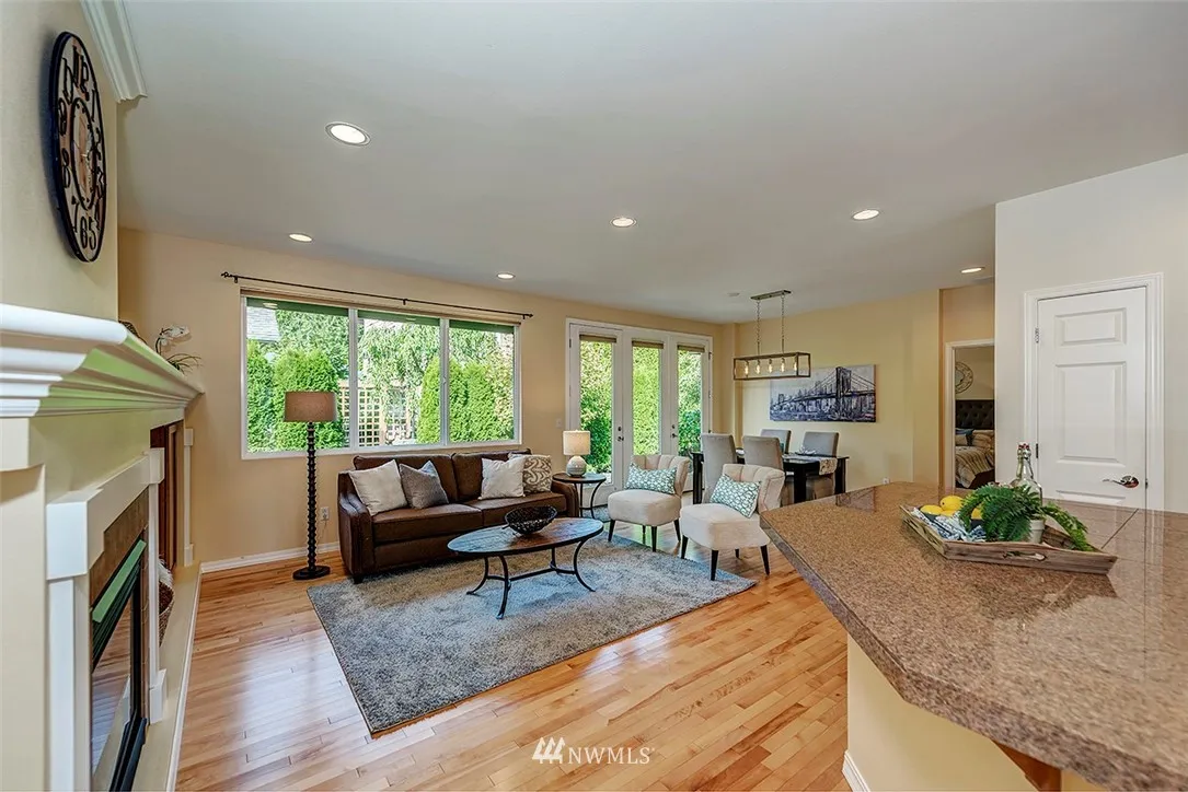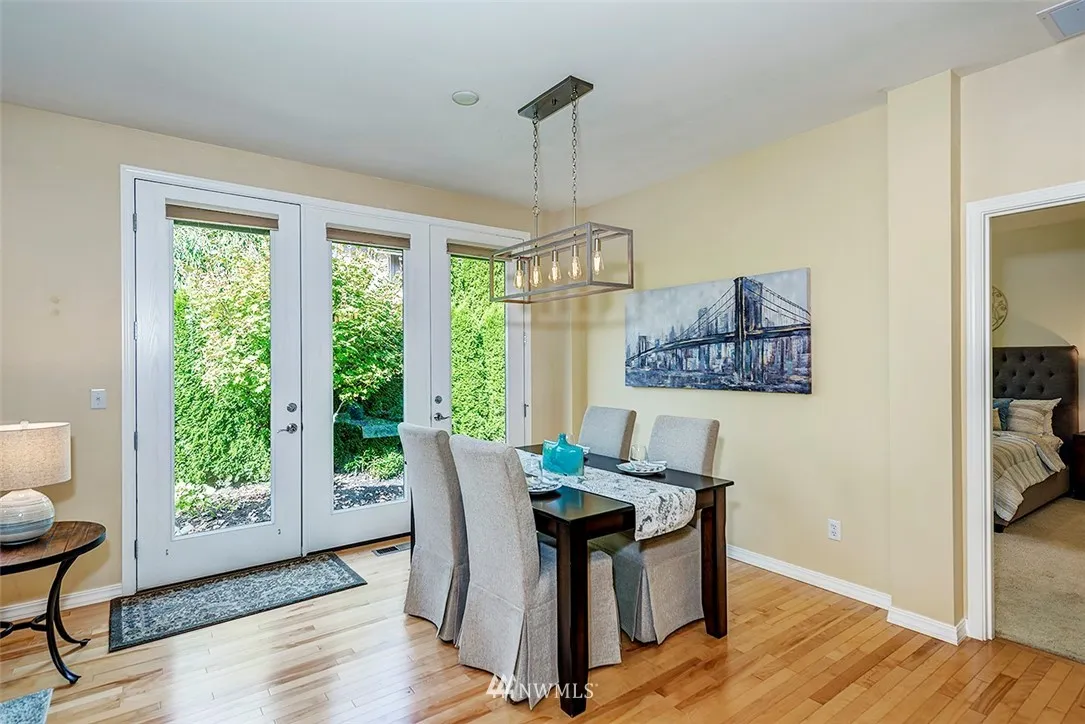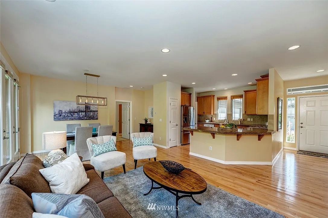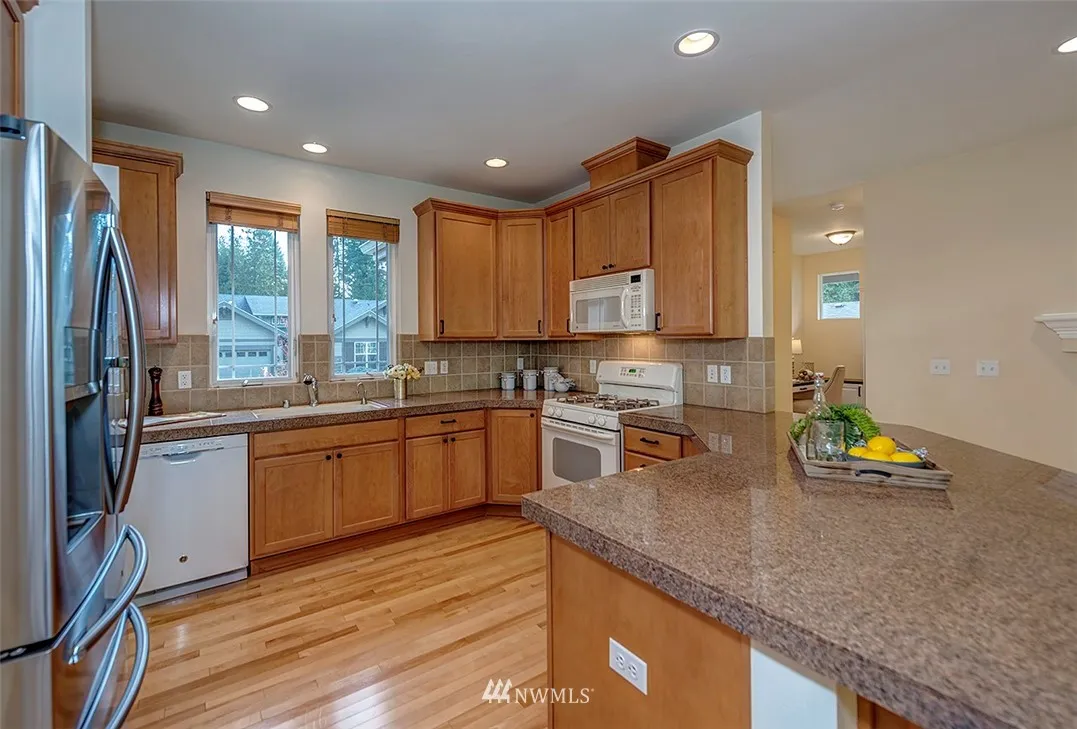 Popular Discovery plan situated on a rare lot with a front & backyard. Hardwood floors flow throughout the bright, open concept living/dining/kitchen space. Carpet in bedrooms & den. Granite counters, 42" tall cabinets & new SS refrigerator. Private patio & garden with remote controlled, retractable awning. A/C from heat pump. Den has new desk & twin Murphy bed.