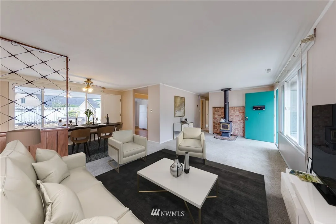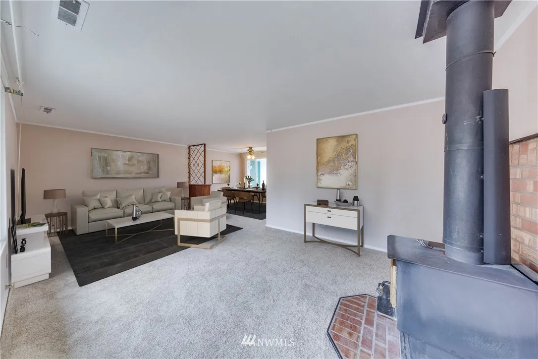 Beautifully updated 4 bedroom rambler on large, totally usable, fully fenced lot! Inviting living room w/cozy freestanding stove opens to dining room. Large windows that drench the rooms with natural sunlight. Light & bright kitchen with tons of cabinets & counter space. Fresh paint and new carpet throughout. Updated, efficient vinyl windows. Newer roof. Attached 1-car garage with room for workshop. Room for RV parking. Close to schools, parks & transit. Super value!