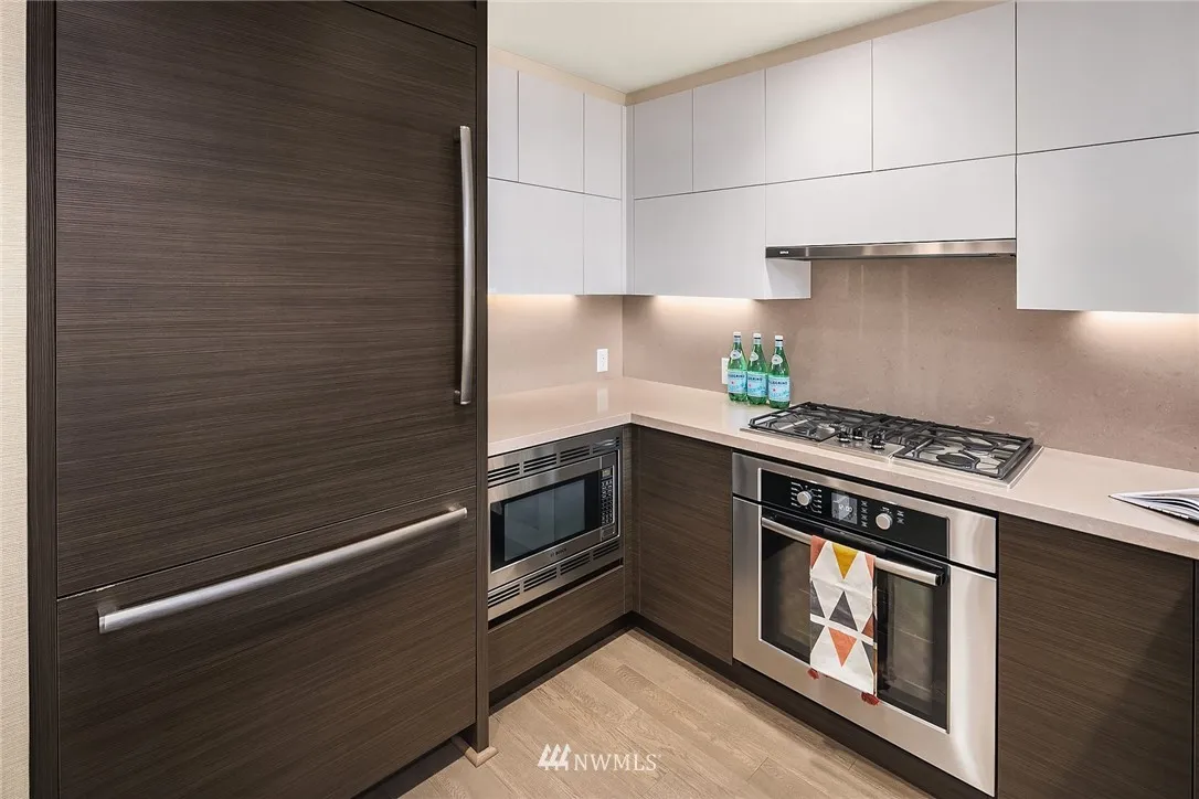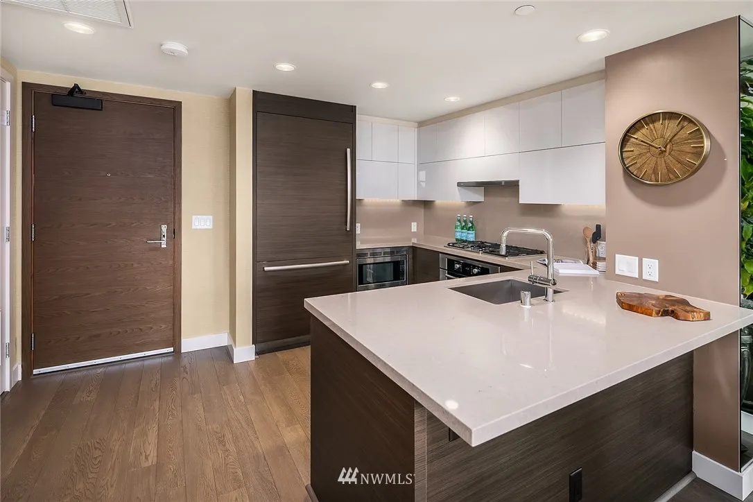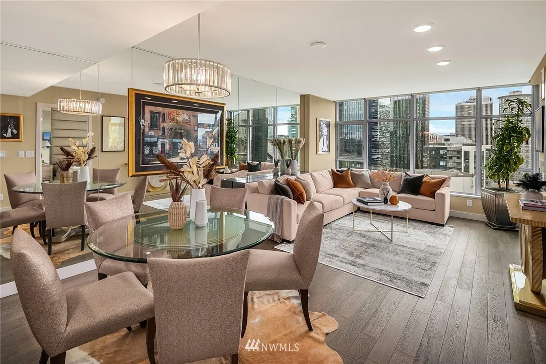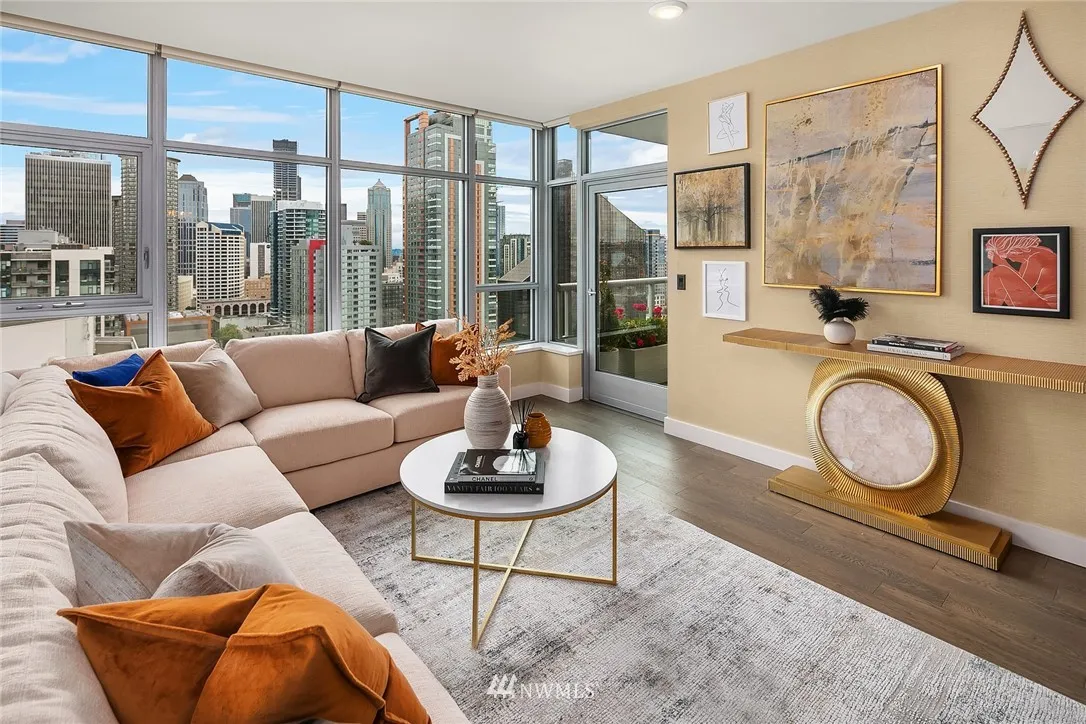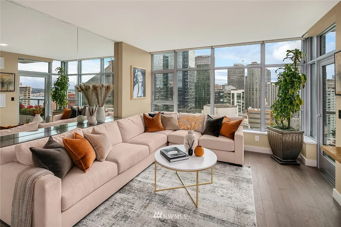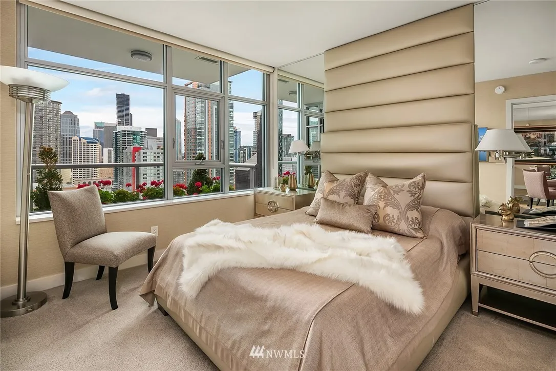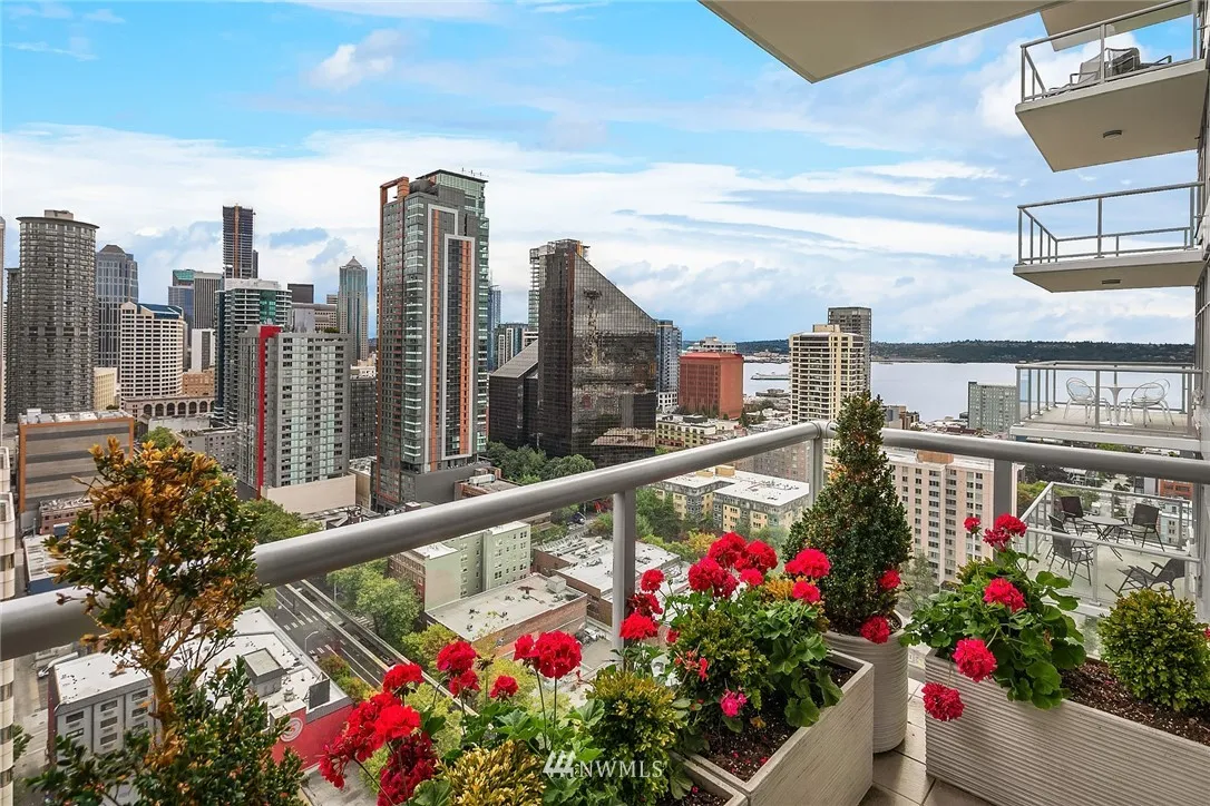 Perched high on the 24th floor of the coveted Insignia, this SW facing unit enjoys unobstructed city & Sound views w/ no future development that will change that. Immaculately maintained, w/ several custom upgrades throughout (wall coverings, closets, built-ins). Central AC, garage parking + storage. Amenities: 2-level gym w/ yoga & Pilates, indoor pool, hot tub/sauna, pet spa & roof retreat, open-air park, 2 roof-top Sky lounges & 24-hr concierge. Walk to Amazon, Pike Place Market & Whole Foods