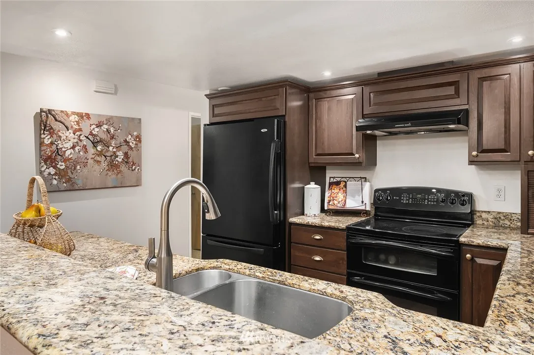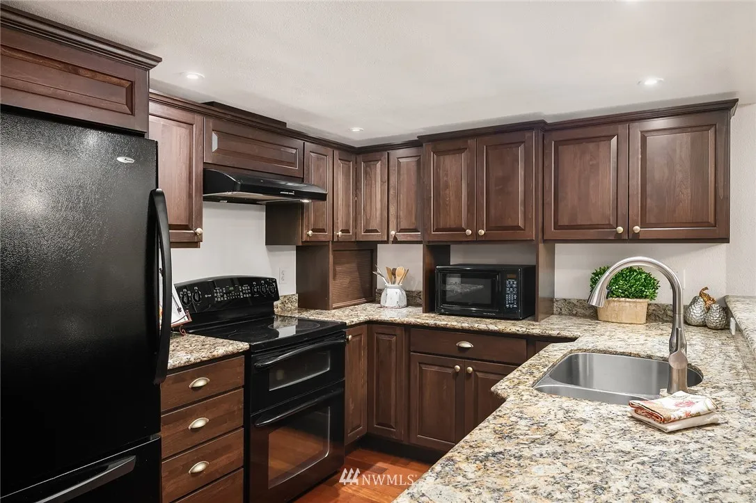 Rare 3 bedroom ground floor end-unit just 1 block to Microsoft with stair-free access. Enjoy privacy from your living room as you unwind after work with no neighboring windows looking in. Open floor plan with engineered hardwoods, updated kitchen, granite counters, breakfast bar & fresh paint throughout. Large laundry room with utility sink, full-size W/D, 2nd fridge & pantry storage area. 1 covered parking + storage unit. Community clubhouse & outdoor pool near unit. Coveted Bellevue Schools!