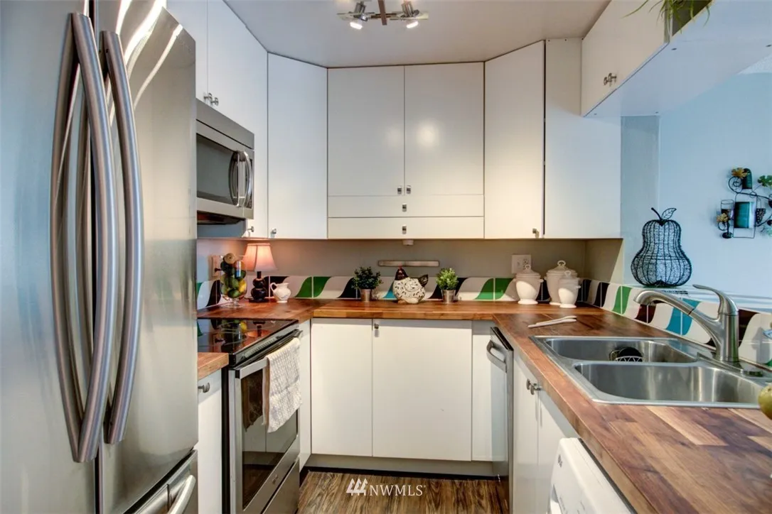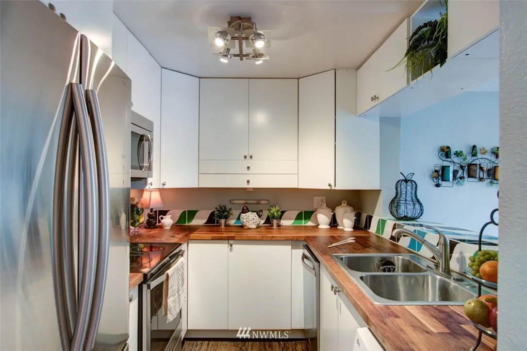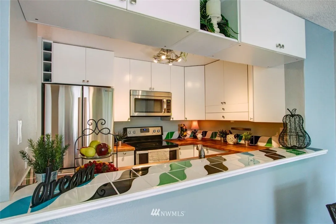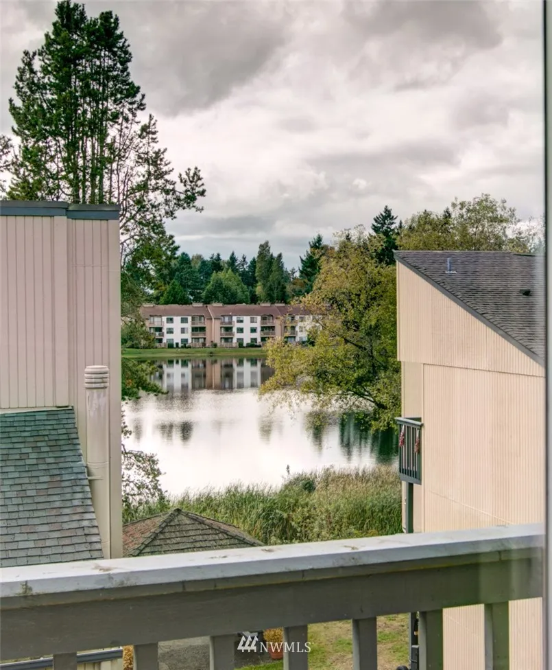 Move-in ready Top Floor End Unit Condo with front & side decks enjoying views of Lake Easter or the pool. Complete with updated kitchen including stainless appliances, butcher block counters & lots of cabinets & pretty newer bath. The community clubhouses sits right on the lake with comfy social room/kitchen, large deck, exercise equipment, hot tub & laundry room with new appliances, though you have your own w/d combo in your home; rare for this complex. Covered pkg. Easy walk to shops & buses.