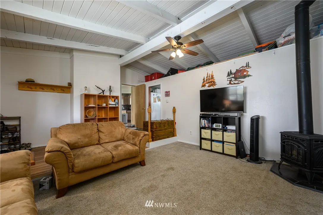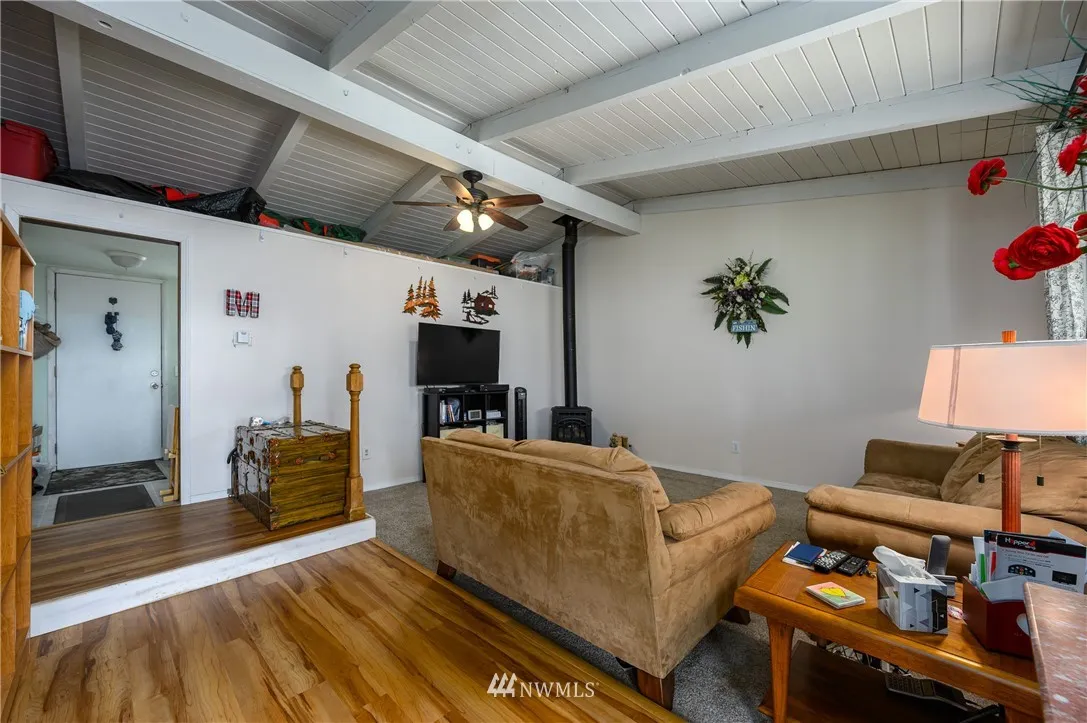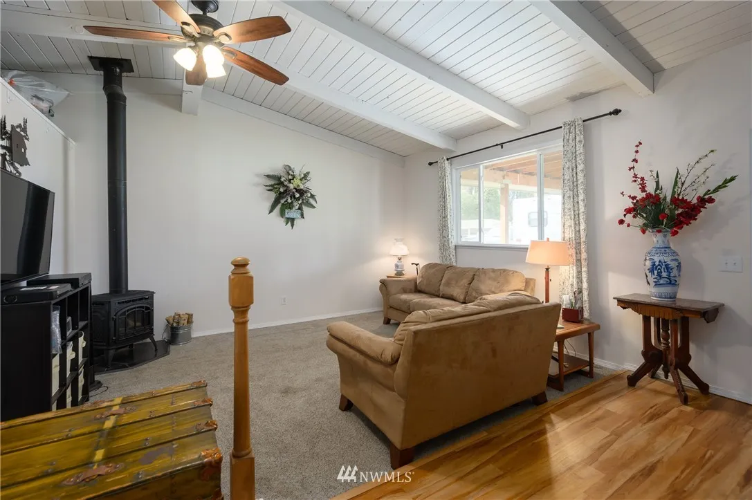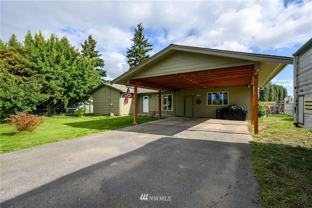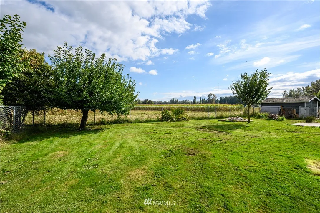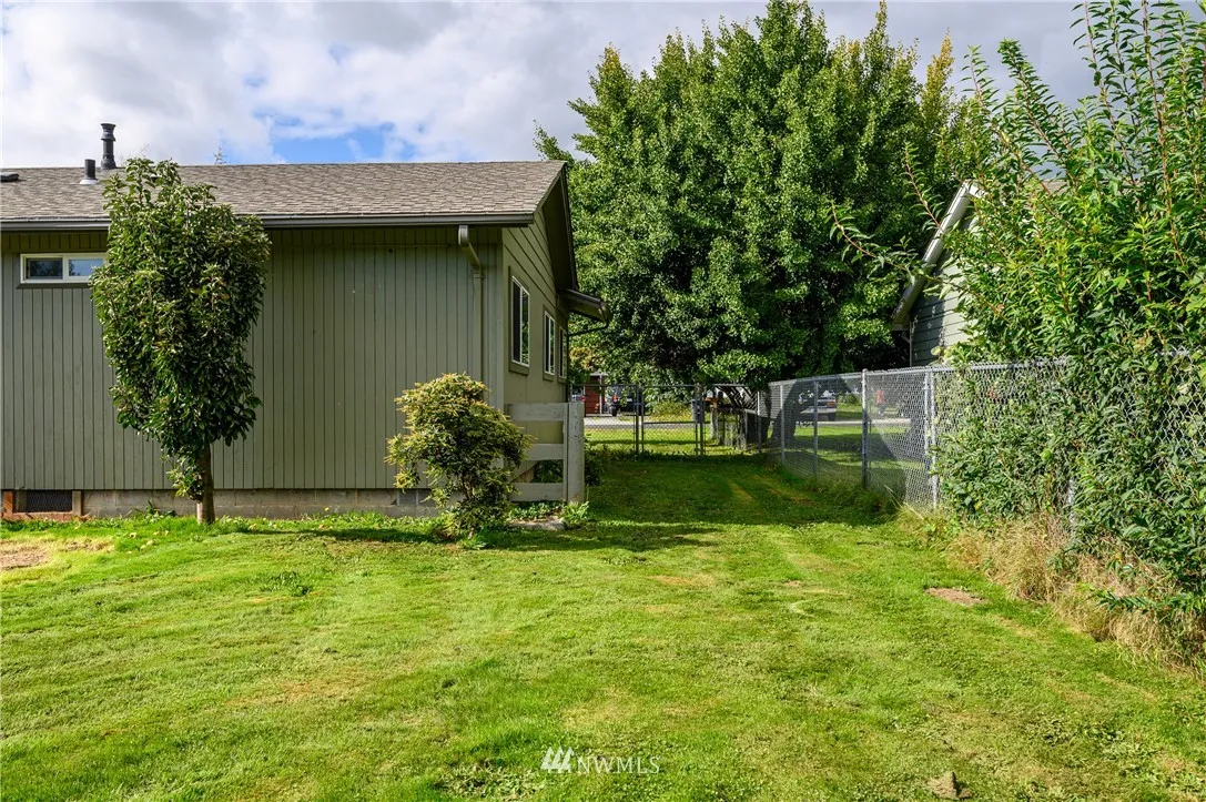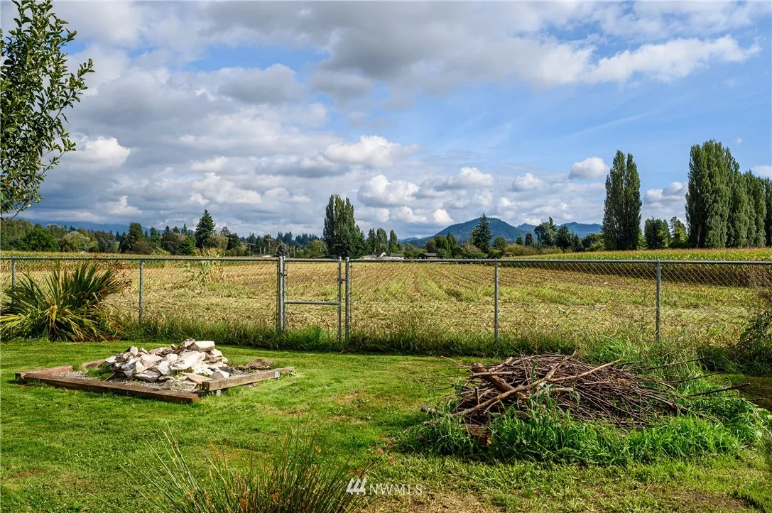 Updated mid-century classic in quiet neighborhood. New cabinets, tile backsplash and solid surface countertops in kitchen. Vaulted ceilings with exposed beams. Large living/family room with gas stove. New laminate flooring in kitchen and dining room. Updated double-pane vinyl windows throughout. Large fully-fenced backyard with views of the Cascades and Skagit Farmland. Plenty of room for your RV. Close to amenities but feels like country living.