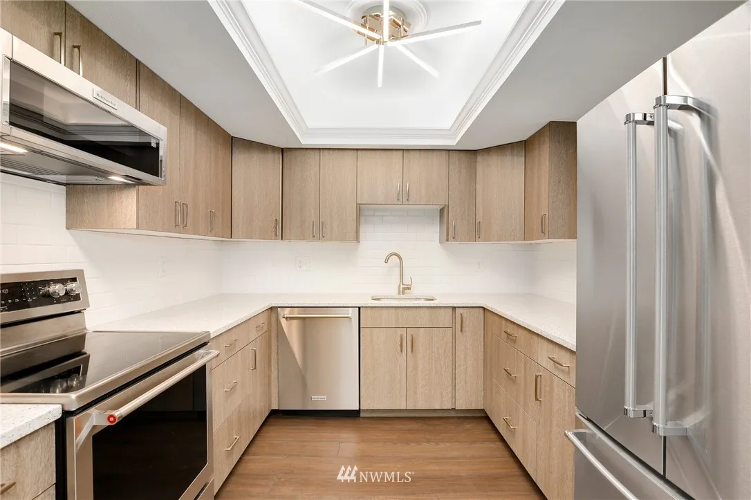 Trendy, remodeled top floor condo @ The Ridge Bellevue! Stunning floor-to-ceiling white rock FP, UPDATED kitchen w/quartz countertops, new cabinets, SS appl. New floors throughout. Master suite w/walk-in closet & 3/4 bath. Guest BR, hall bath & in-unit laundry. Individual garage w/storage room & assigned parking. Covered Patio. Amenities include pool, hot tub & clubhouse. Minutes to 520, DT Bellevue, DT Kirkland & Seattle. EZ commute to MSFT, GOOG & AMZN. NO rental cap; NO special assessments!