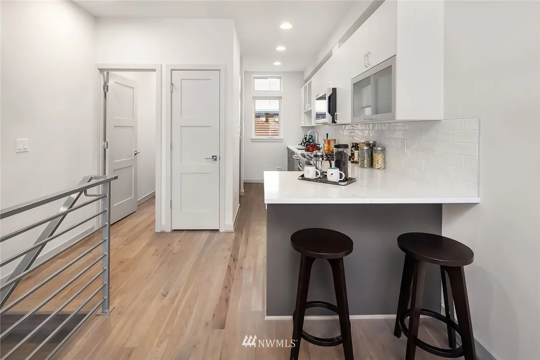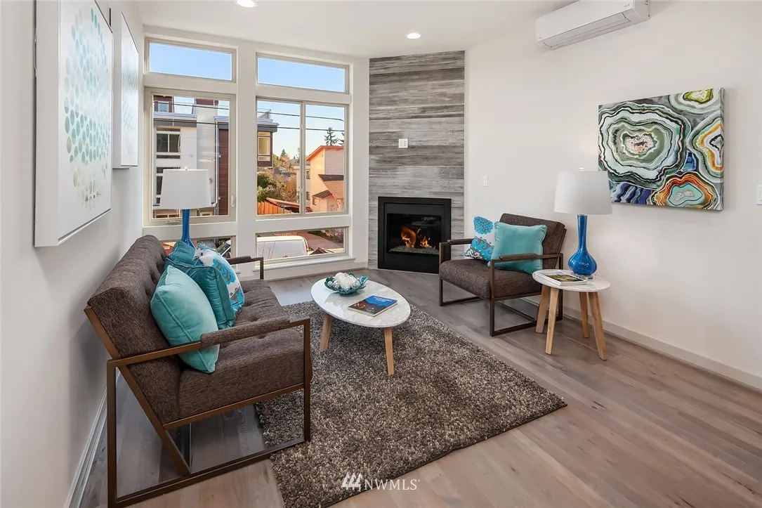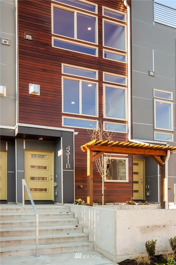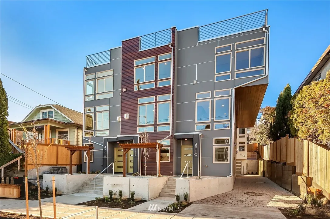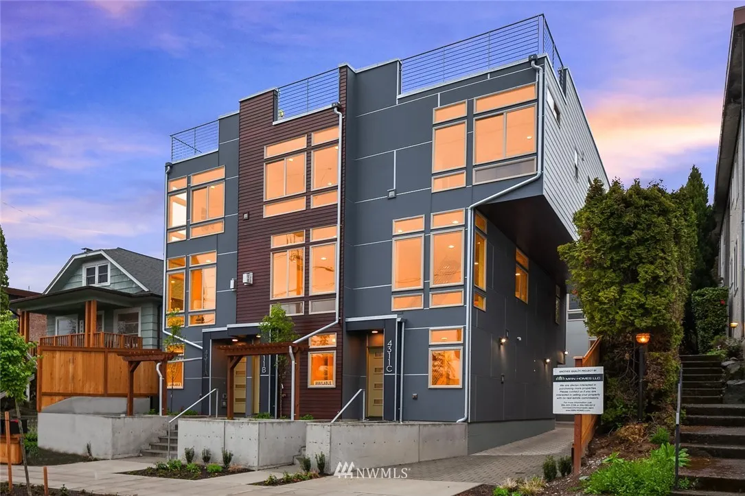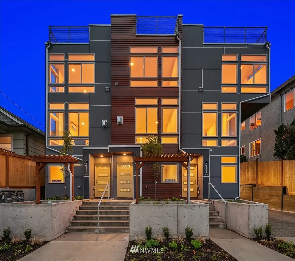 New modern home in prime Fremont/Wallingford location. This unit features a gourmet kitchen, high quality premium fixtures and finishes, gleaming hardwood floors, open floor plan, abundance of light from walls of windows, show-piece floating steel staircase, and A/C. Unwind in the top floor master with walk in closet and spa-like bath. Huge roof top deck with incredible views of the Seattle skyline and Lake Union. Off street reserved parking space included. 4 Star Built Green.