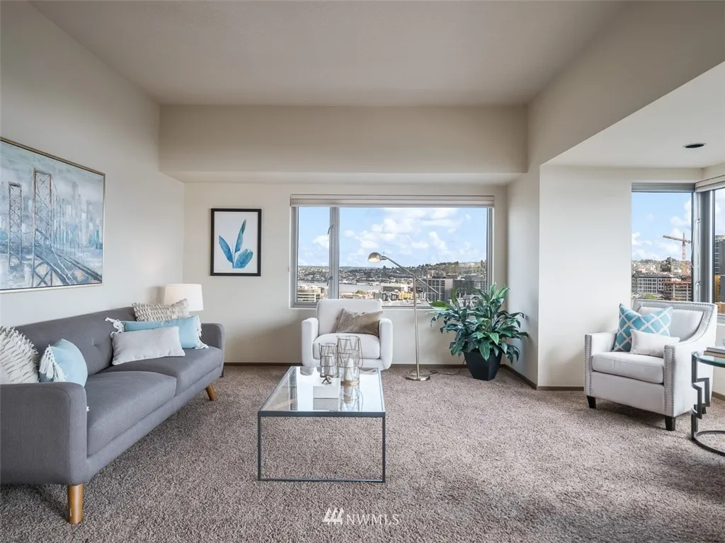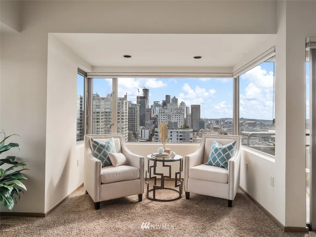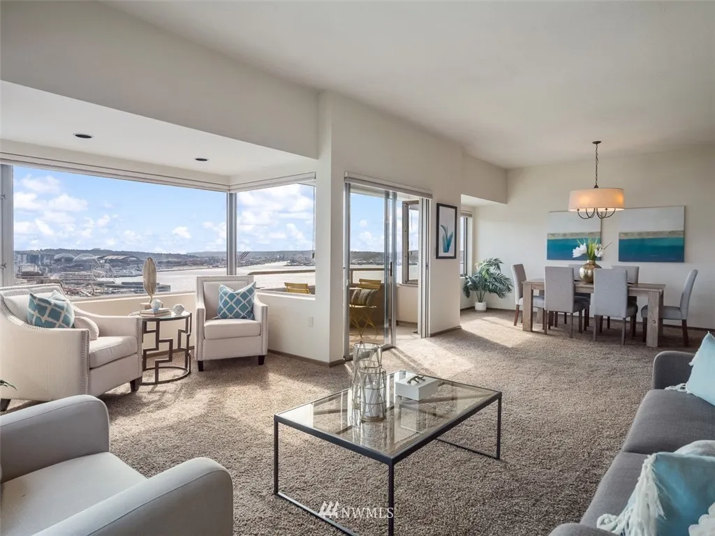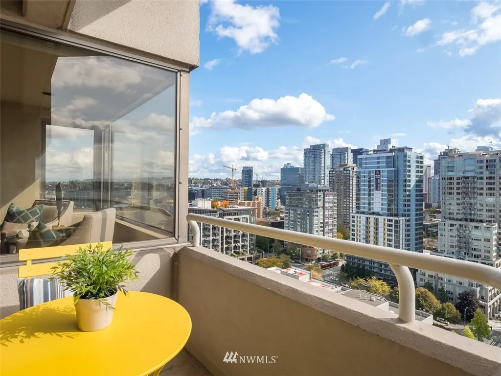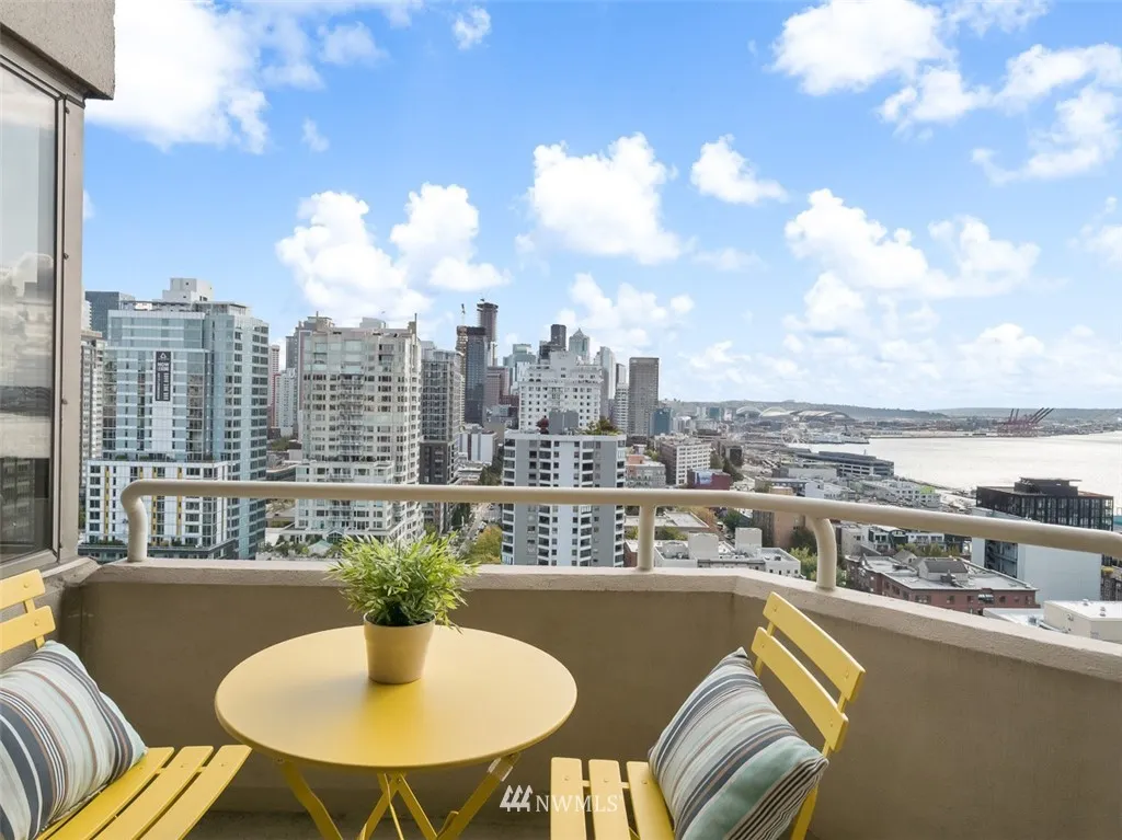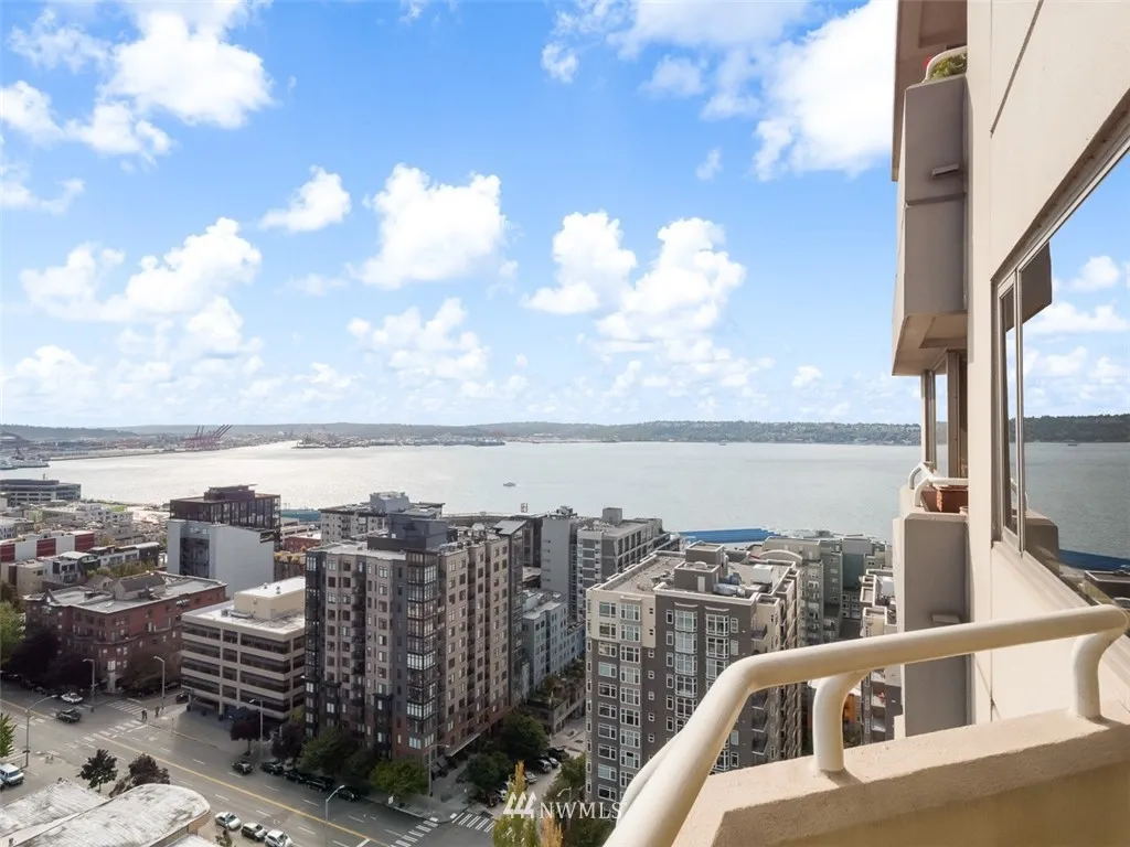 Are you lookg for views of the sound, city skyline, Mt. Rainier, Lk Union, Space Needle & even Mt. Baker, this is it! Breathtakg & spectacular day & night! Immac cond, freshly paintd w/over 1300sf SE crner hme. Soak up the views on your cov'd deck. Beautiful kitchen w/stunng cabinetry, corian cntps, ss applcs & undercabinet lightg. Wonderful mstsuite w/db vanity bath. Lux amen 24 hr concierge, indoor pool, spa, sauna, exer rm, party rm, gst ste & new rooftop deck! Steps to dining & shopping!