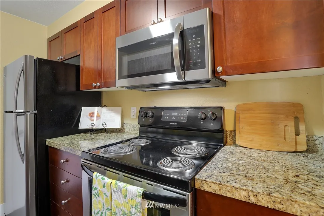Spacious 2 bedroom, top floor condominium includes granite counters, stainless appliances, designer colors, in-suite laundry, individual parking, private balcony plus a large dual sink bathroom. Enjoy double pane windows, livable floorplan, secured entry, and close proximity to freeways, Oaktree shopping & theaters. Affordable FHA