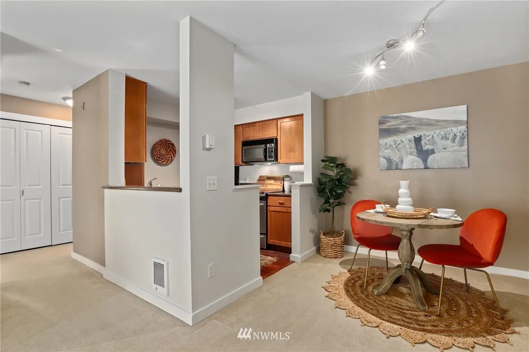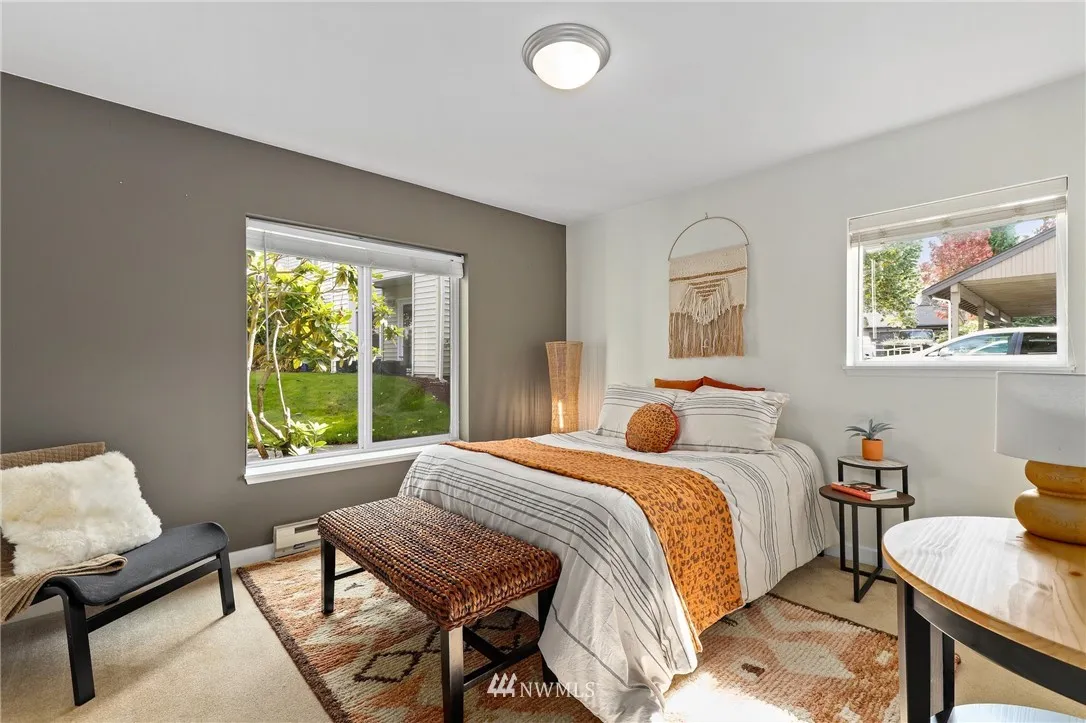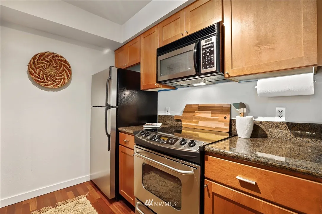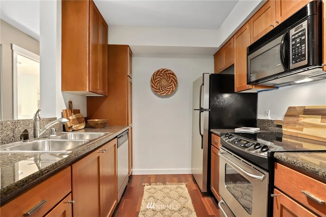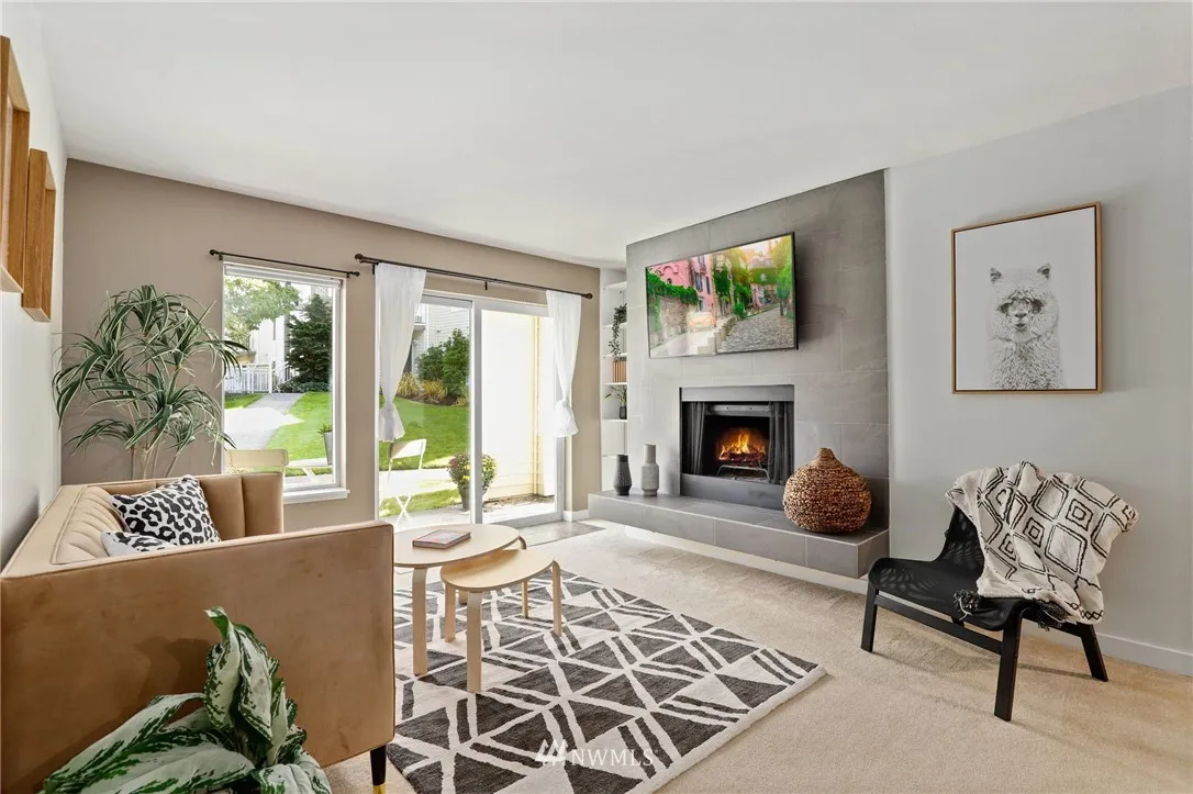 Spacious, move-in ready 1bdrm condo w/TWO reserved parking spaces! Updated kitchen feats SS appliances, granite counters & glass-top range. Comfortable living rm has cozy wood-burning fireplace, custom tile feature & mounted TV included! Master bdrm has 2 windows &WIC. Brand-new washer/dryer incl! Patio w/storage closet opens to manicured lawn. 3 community pools, gym, outdoor BBQ areas, indoor BBall court, clubhouse & game room. Near I-5, 405, Boeing, beaches, shopping, dining, parks & schools!