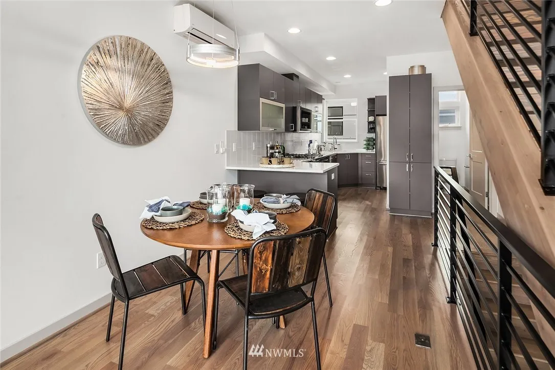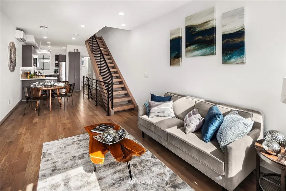 Tastefully designed corner home by MRN Homes in excellent Ballard location.Featuring a desirable open floor plan with top of the line finishes, tons of natural light, chef's kitchen w/SS appliances, modern fireplace, sleek hardwood floors and A/C. Spacious top floor master bedroom with 5-piece deluxe bath, soaking tub, and large walk-in closet. Entertain on the huge roof top deck with nice views. Close to local shops and restaurants. Off street reserved parking space included.4 Star Built Green.