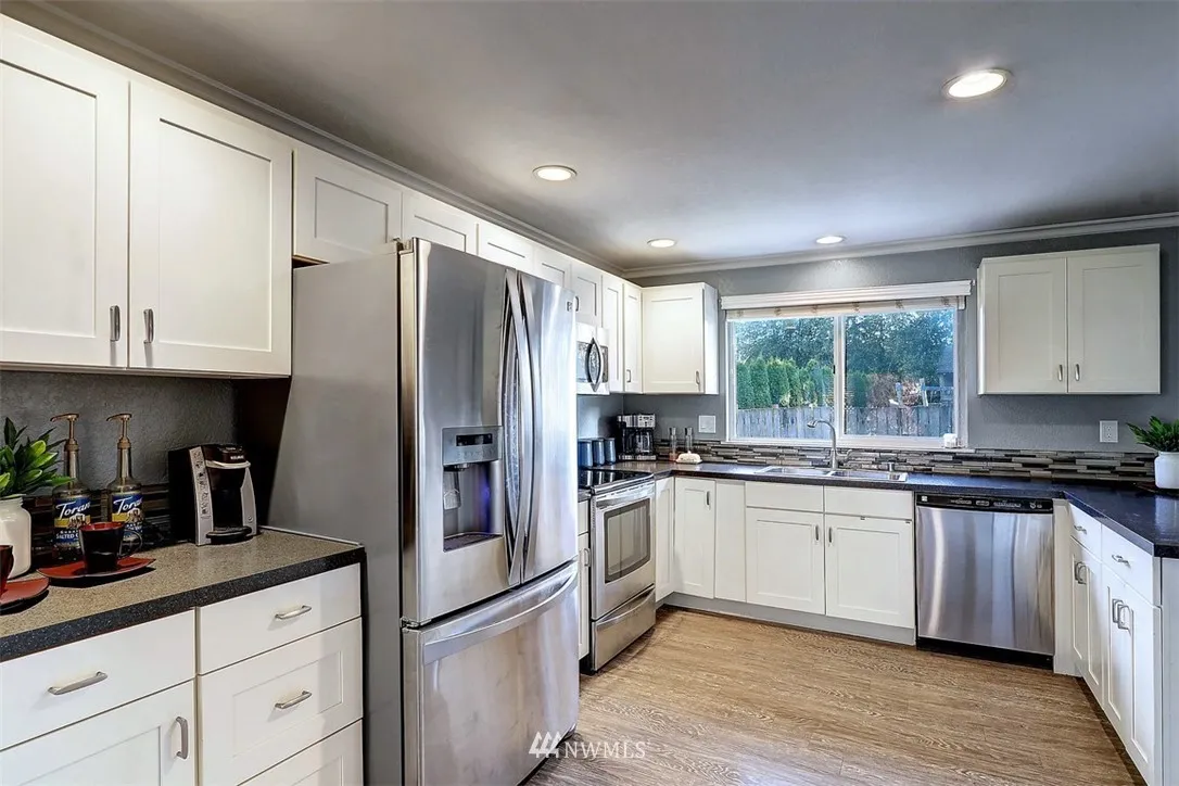 Charming remodeled home down private drive, set back from Beverly. Lg flat lot w/fully fenced RV parking. Living room w/large picture window, dining/family room w/cozy wood stove. Remodeled kitchen w/white shaker cabinets, stainless appliances & eating bar. Master w/walk in closet and 3/4 bath. Slider to flagstone patio, stone fountain, stocked wood shed & lg private flat yard. New roof! New low maintenance flooring throughout. Excellent commuter location w/quick I-5 access, EZ Boeing commute.