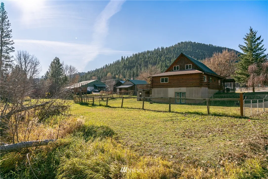Amazing opportunity to own picture perfect log home less than 4 miles from Leavenworth. 7+ prime acres w/ stunning views. Living room w/ vaulted ceilings, fireplace and open concept. Nice separation of space w/ 5 bedrooms and 3 bathrooms spread over two floors. Two shops allow for parking for 6+ vehicles + shop space. Quaint creek setting w/ room for livestock including barn with 3 stalls + coop. Two wells, newer water softener, HVAC system and water heater. Includes two separate tax parcels.