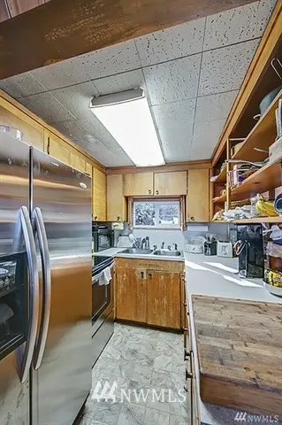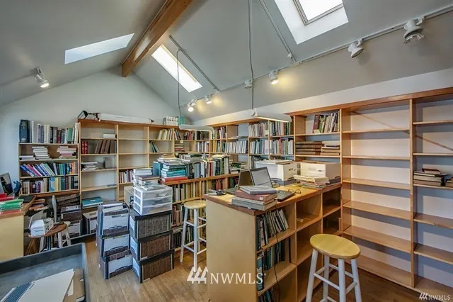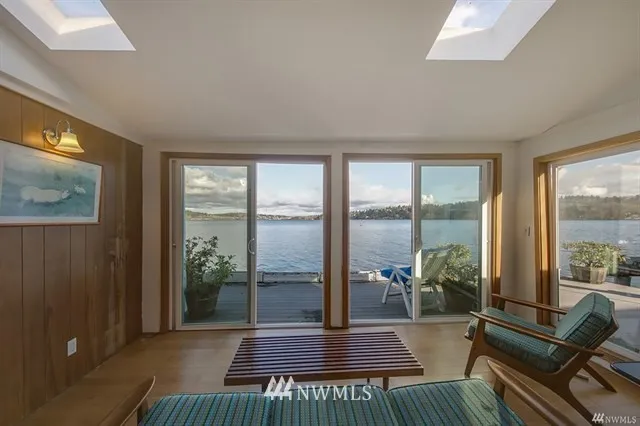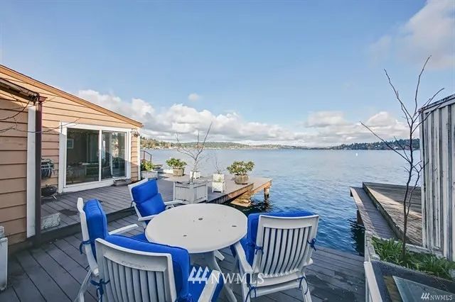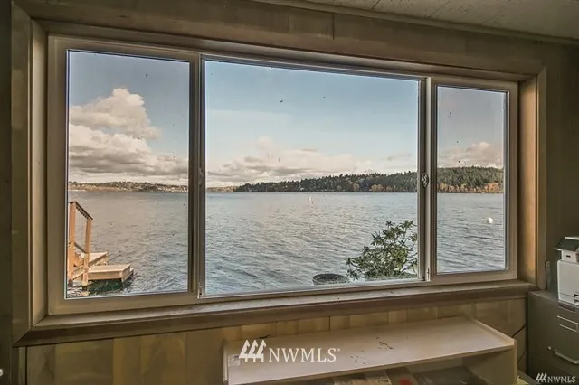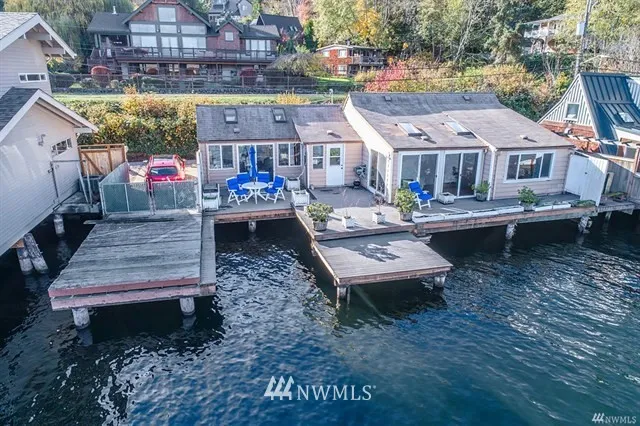 Fun houseboat alternative. Chance to live on/over the water with 70 ft of waterfront ambiance, wonderful views, waterfront decks/moorage. 1942 home likely needs structural, piles, piers & fixer type help. Part of home is fairly recently remodeled as library with skylights and high ceilings. Rest has newer windows and lots of light but the cabin vibe needs help, or remodel/rebuild entirely to suit. Next to BG Trail, close to Lake City shops/restaurants
